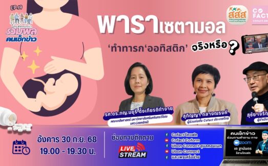 1 ตุลาคม 2025 ประเด็นสุขภาพ พาราเซตามอลทำทารกออทิสติก” จริงหรือ? ผู้เชี่ยวชาญชี้แจงข้อเท็จจริงในโคแฟคสนทนา
