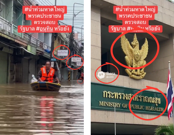 🔎 Cofact investigation: Almost all of the visuals in this clip were generated using Sora, an AI model developed by OpenAI—the same company behind ChatGPT. This is evident from the logo and application name clearly visible throughout the clip. Multiple anomalies were also identified, such as shop signs made up of meaningless word clusters, Ministry of Public Health signs misspelled in both English and Thai, a golden Garuda emblem on a building that differs from the authentic national emblem, and inconsistent flood levels—described in narration as “almost waist-high,” while the background water appears only ankle-deep.