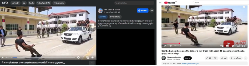 ▪ วันที่ 9 มี.ค. 63 ช่องยูทูบ “Weapons Update” โพสต์คลิปเดียวกันพร้อมคำบรรยายเป็นภาษาอังกฤษผสมภาษาเขมร แปลเป็นไทยได้ว่า “ทหารกัมพูชาใช้ปากคาบเชือกลากรถที่บรรทุกคนนับสิบ”