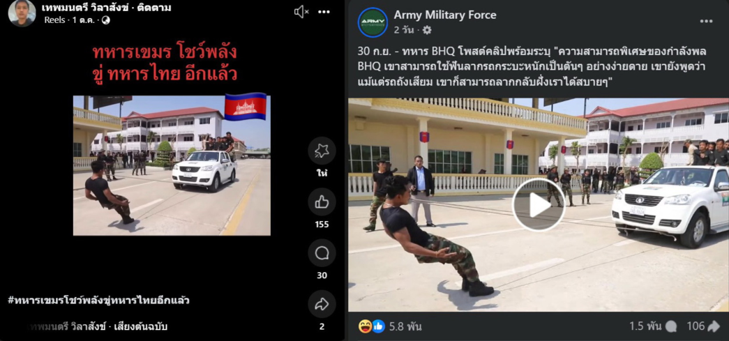 ขณะที่เพจเฟซบุ๊ก “Army Military Force” โพสต์คลิปเดียวกันนี้เมื่อวันที่ 30 ก.ย. 68 มีคำบรรยายประกอบว่า “30 ก.ย. – ทหาร BHQ โพสต์คลิปพร้อมระบุ ‘ความสามารถพิเศษของกำลังพล BHQ เขาสามารถใช้ฟันลากรถกระบะหนักเป็นตันๆ อย่างง่ายดาย เขายังพูดว่า แม้แต่รถถังเสียม เขาก็สามารถลากกลับฝั่งเราได้สบายๆ’” ซึ่งมีสื่อโทรทัศน์บางสำนักนำไปรายงานต่อ