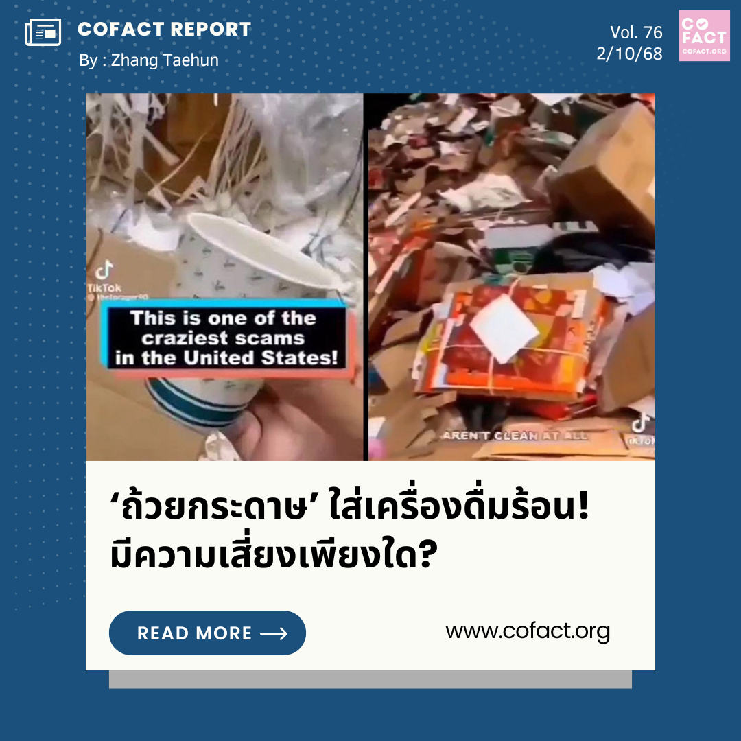 “This is one of the craziest scams in the United States! (นี่คือหนึ่งในเรื่องหลอกลวงที่บ้าคลั่งที่สุดในสหรัฐอเมริกา)” เป็นคำบรรยายพาดหัวคลิปวิดีโอหนึ่งที่แชร์กันในสื่อสังคมออนไลน์ในช่วงไม่กี่สัปดาห์ที่ผ่านมา (บทความนี้เขียนเมื่อวันที่ 26 ก.ย. 2568) ทั้งที่เป็นภาษาไทยและต่างประเทศ โดยคลิปดังกล่าวได้บรรยายเป็นภาษาอังกฤษว่า หลายคนเชื่อว่าถ้วยกระดาษที่นำมาเป็นภาชนะใส่เครื่องดื่มร้อน (เช่น กาแฟ) ทำจากเยื่อกระดาษบริสุทธิ์ (Clean Pulp) แต่จริงๆ แล้ววัสดุที่ใช้มาจากขยะรีไซเคิล