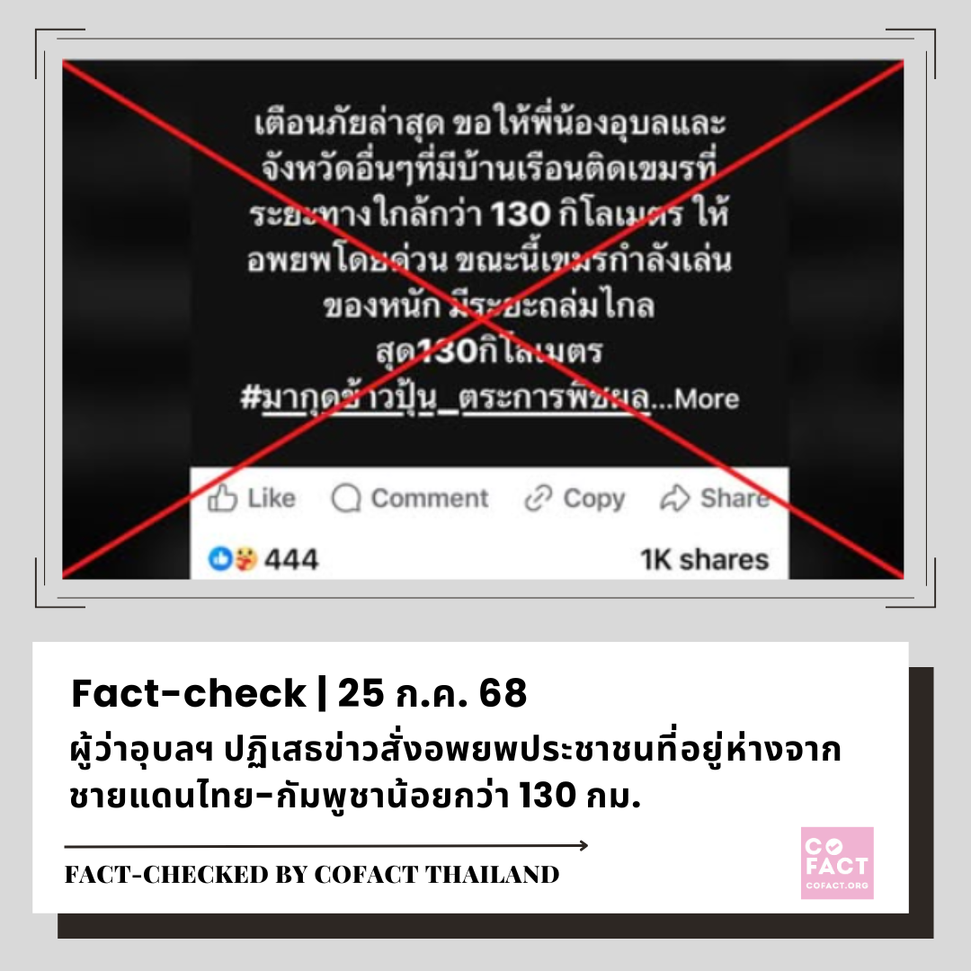 ผู้ว่าอุบลฯ ปฏิเสธข่าวสั่งอพยพประชาชนที่อยู่ห่างจากชายแดนไทย-กัมพูชาน้อยกว่า 130 กม.