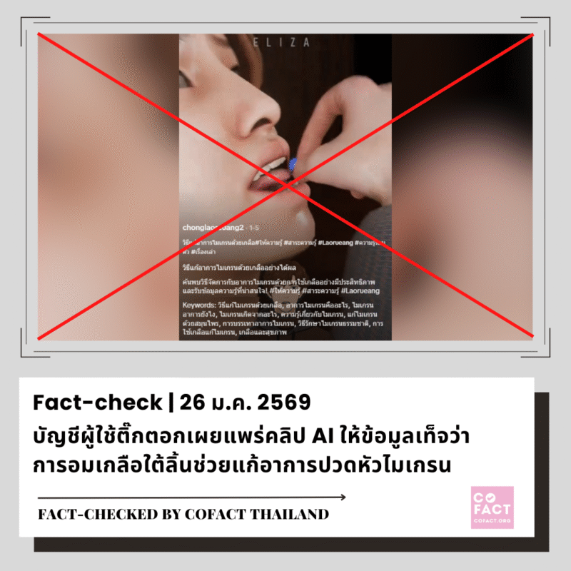 เนื้อหาเป็นเท็จ บัญชีติ๊กตอกเผยแพร่คลิป AI ให้ข้อมูลเท็จว่าอมเกลือใต้ลิ้นช่วยแก้อาการปวดหัวไมเกรน 26/01/26