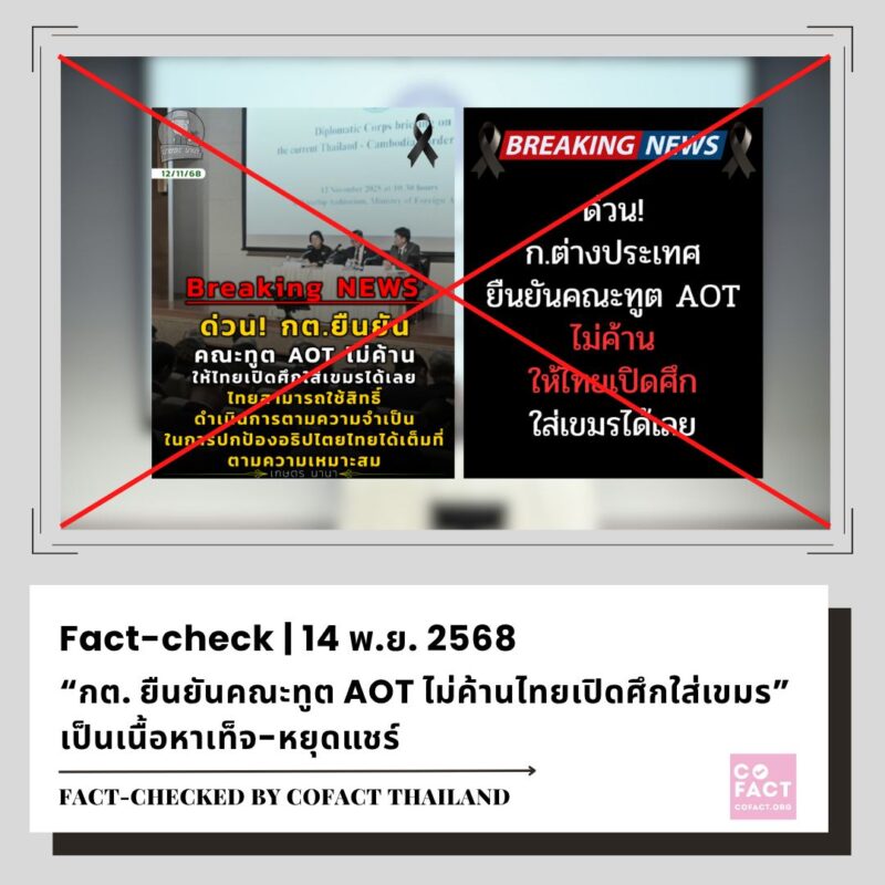17/11/25 Top Fact Checks ไทย - กัมพูชา “กต. ยืนยันคณะทูต AOT ไม่ค้านไทยเปิดศึกใส่เขมร” เป็นเนื้อหาเท็จ-หยุดแชร์ เนื้อหาเป็นเท็จ