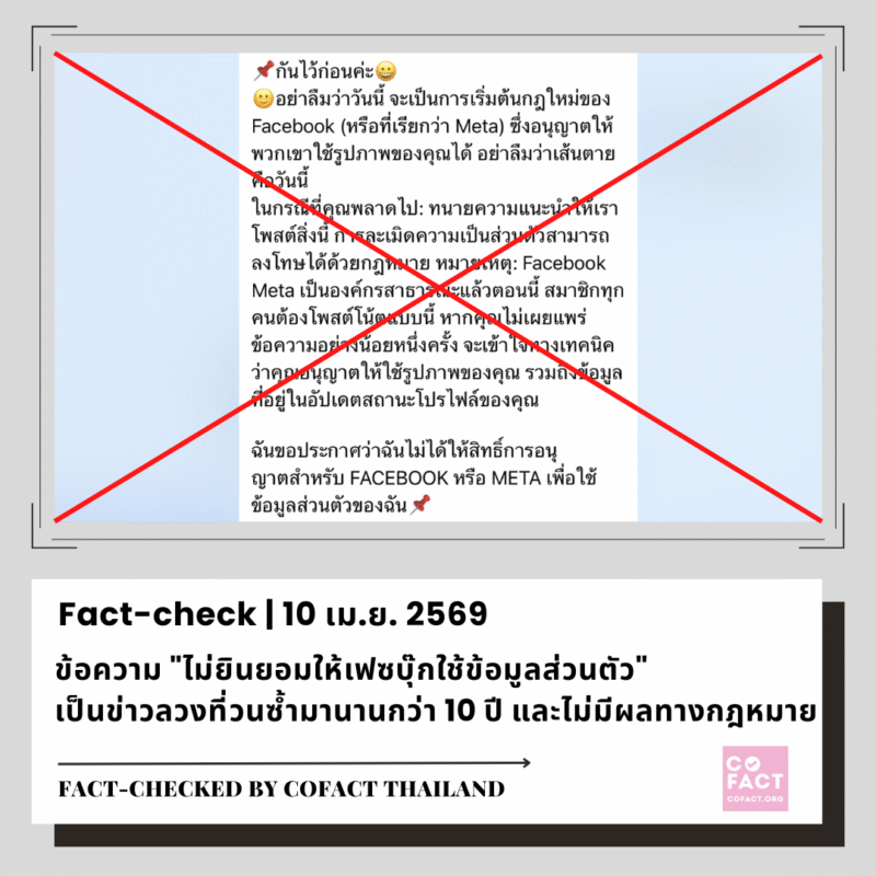 10/04/26 ข้อความ “ไม่ยินยอมให้เฟซบุ๊กใช้ข้อมูลส่วนตัว” เป็นข่าวลวงวนซ้ำ และไม่มีผลทางกฎหมาย เนื้อหาเป็นเท็จ