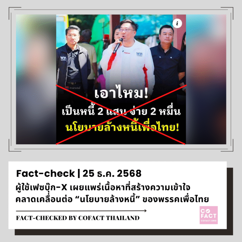 25/12/25 Top Fact Checks Political ผู้ใช้เฟซบุ๊ก-X เผยแพร่เนื้อหาที่สร้างความเข้าใจคลาดเคลื่อนต่อ “นโยบายล้างหนี้” ของพรรคเพื่อไทย เนื้อหาที่ทำให้เข้าใจผิด