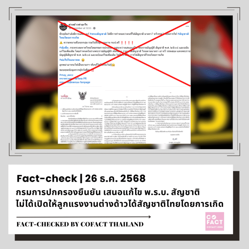 26/12/25 Top Fact Checks ไทย - กัมพูชา กรมการปกครองยืนยัน เสนอแก้ไข พ.ร.บ. สัญชาติ ไม่ได้เปิดให้ลูกแรงงานต่างด้าวได้สัญชาติไทย เนื้อหาที่ทำให้เข้าใจผิด