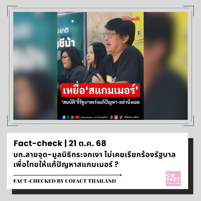 21/10/25 Top Fact Checks Political บก.ลายจุด-มูลนิธิกระจกเงา ไม่เคยเรียกร้องรัฐบาลเพื่อไทยให้แก้ปัญหาสแกมเมอร์ ? เนื้อหาที่ทำให้เข้าใจผิด