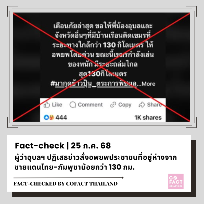 25/07/25 Top Fact Checks ไทย - กัมพูชา ผู้ว่าอุบลฯ ปฏิเสธข่าวสั่งอพยพประชาชนที่อยู่ห่างจากชายแดนไทย-กัมพูชาน้อยกว่า 130 กม.