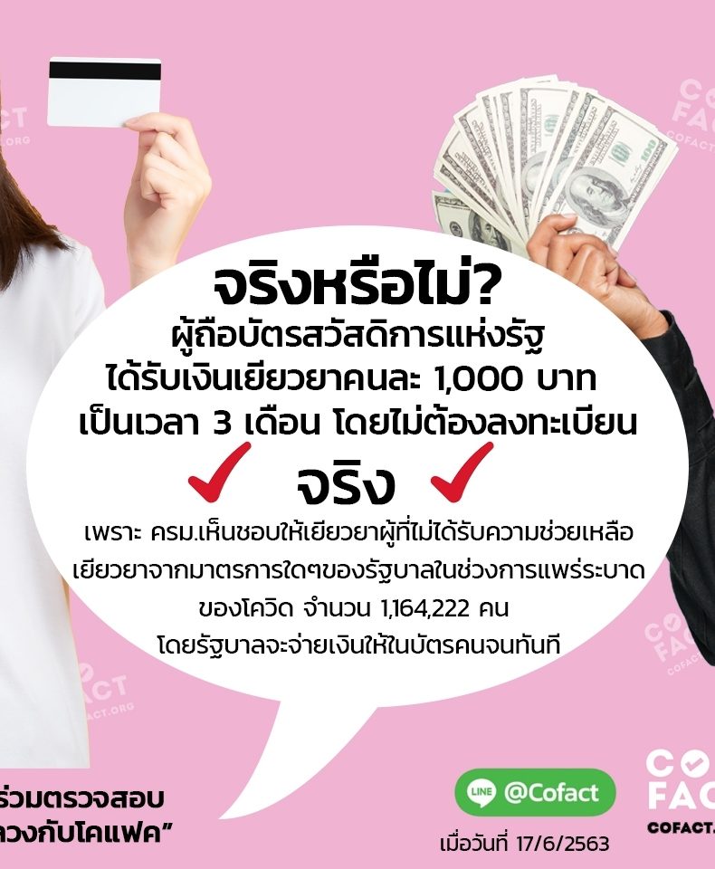 จริงหรือไม่? ผู้ถือบัตรสวัสดิการแห่งรัฐ ได้รับเงินเยียวยาคนละ 1,000 บาท เป็นเวลา 3 เดือน โดยไม่ต้องลงทะเบียน