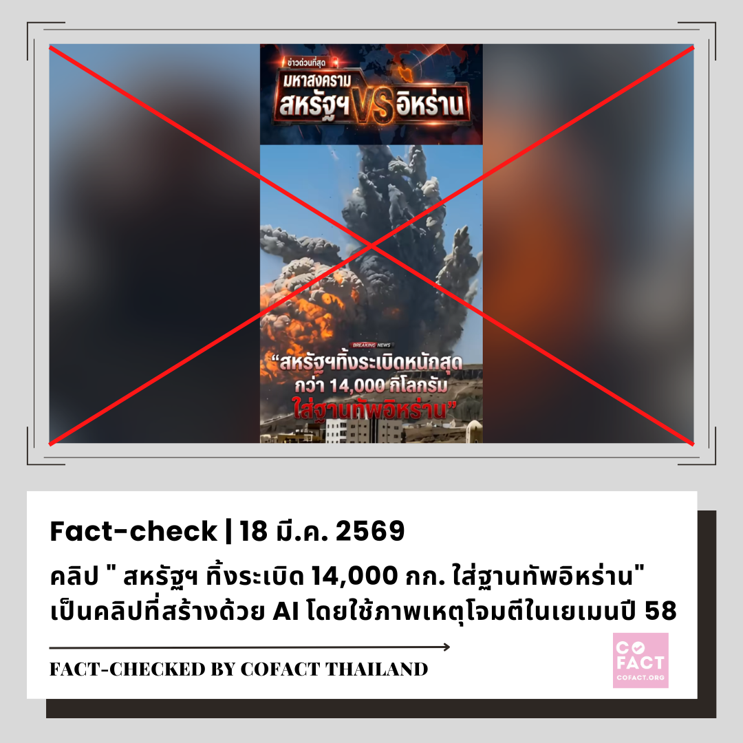 ❌ ผลการตรวจสอบข้อเท็จจริง: **เนื้อหาเท็จ** เป็นคลิปที่สร้างจาก AI โดยใช้ภาพต้นฉบับจากเหตุระเบิดในกรุงซานา ประเทศเยเมน เมื่อเดือน เม.ย.2558