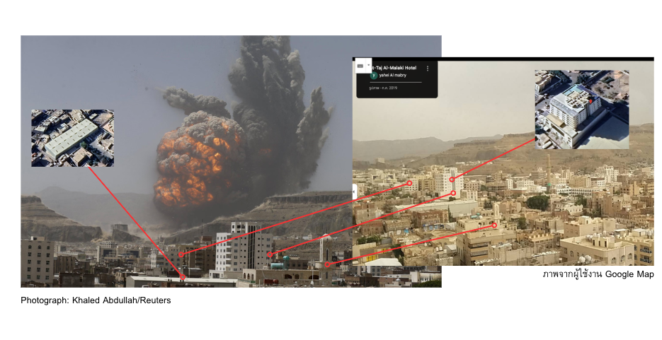 🔎โคแฟคตรวจสอบ: จากการค้นหาภาพด้วย Google Lens พบว่าสำนักข่าวต่างประเทศ เช่น Al Jazeera, CNN, และ The Guardian เคยเผยแพร่ภาพเหตุระเบิดครั้งนี้เมื่อวันที่ 21 เม.ย. 2558 โดยรายงานว่าซาอุดิอาระเบียปฏิบัติการโจมตีฐานที่มั่นของกลุ่มกบฏฮูตีในเขต Faj Attan ทางตะวันออกของกรุงซานา เมืองหลวงของเยเมน