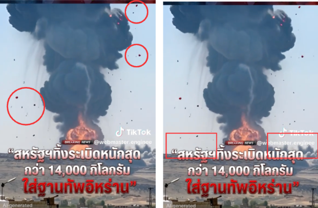 วันเดียวกัน บัญชีเฟซบุ๊ก “Army Armed Forces ยุทโธปกรณ์กองทัพ” โพสต์ภาพระเบิดขนาดใหญ่ซึ่งเป็นภาพเดียวกับที่ปรากฏในคลิป บรรยายด้วยข้อความเดียวกันว่าสหรัฐฯ ทิ้งระเบิดขนาด 14,000 กก. ถล่มบังเกอร์อิหร่านที่อยู่ใต้ภูเขา โพสต์นี้ถูกแชร์มากกว่า 1,000 ครั้ง ณ วันที่ 18 มี.ค.