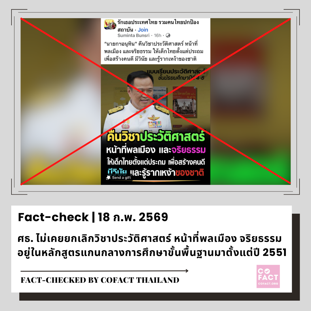 ❓ เนื้อหาที่ตรวจสอบ: อนุทินคืนวิชาประวัติศาสตร์ หน้าที่พลเมือง และจริยธรรมให้เด็กไทย