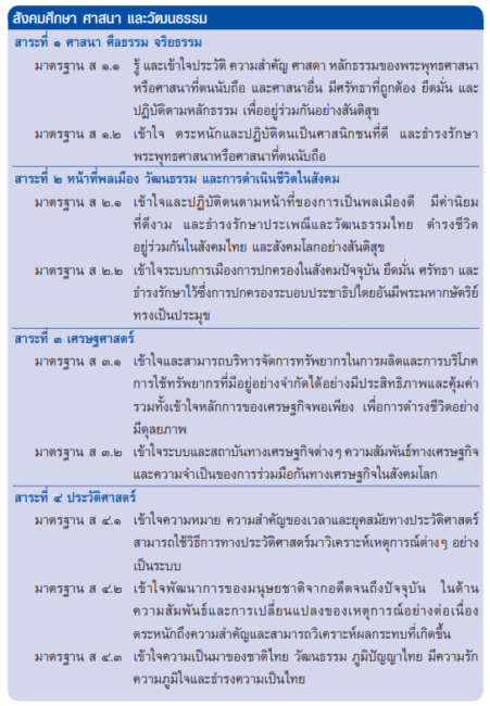 ในส่วนของกลุ่มสาระการเรียนรู้สังคม ศาสนา และวัฒนธรรม ประกอบด้วย 4 สาระหลัก คือ (1) ศาสนา ศีลธรรม จริยธรรม (2) หน้าที่พลเมือง วัฒนธรรม และการดำเนินชีวิตในสังคม (3) เศรษฐศาสตร์ และ (4) ประวัติศาสตร์
