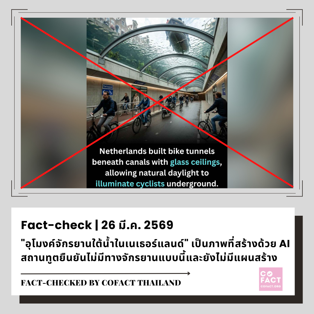 โคแฟคสอบถามสถานทูตเนเธอร์แลนด์ประจำประเทศไทยเกี่ยวกับ “อุโมงค์จักรยานเพดานกระจกใต้ลำคลอง” เจ้าหน้าที่ฝ่ายเศรษฐกิจยืนยันผ่านข้อความตอบกลับทางอีเมลว่า “เนเธอร์แลนด์ยังไม่มีอุโมงค์จักรยานใต้น้ำตามที่ปรากฏในภาพ และจากการตรวจสอบไม่พบว่ากำลังมีการก่อสร้างหรือมีโครงการจะสร้างทางจักรยานลักษณะนี้ในอนาคต คาดว่าภาพนี้เป็นภาพที่สร้างด้วย AI”