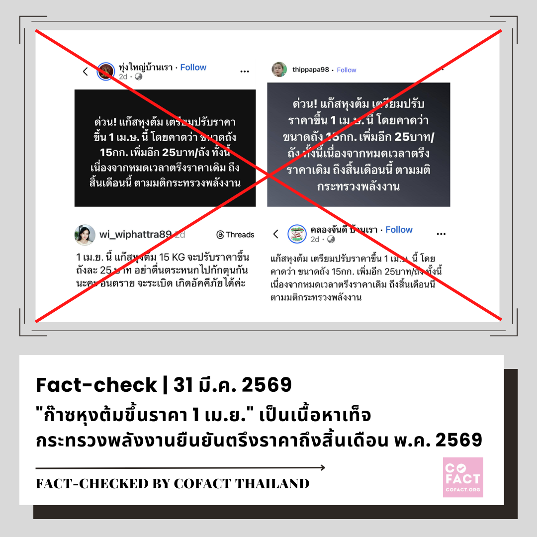 📝 เนื้อหาโดยสรุป: วันที่ 29 มี.ค. 2569 มีผู้แจ้งเข้ามาในเว็บบอร์ดของโคแฟค cofact.org ให้ตรวจสอบข้อความอ้างว่าราคาก๊าซหุงต้มจะขึ้นราคาในวันที่ 1 เม.ย. ซึ่งเผยแพร่ทั้งในเฟซบุ๊ก อินสตาแกรม และ Threads ระหว่างวันที่ 29-30 มี.ค. ระบุว่า “ด่วน! แก๊สหุงต้มเตรียมปรับราคาขึ้น 1 เม.ย. นี้ โดยคาดว่าขนาดถัง 15 กก. เพิ่มอีก 25 บาท/ถัง ทั้งนี้เนื่องจากหมดเวลาตรึงราคาเดิม ถึงสิ้นเดือนนี้ ตามมติกระทรวงพลังงาน”