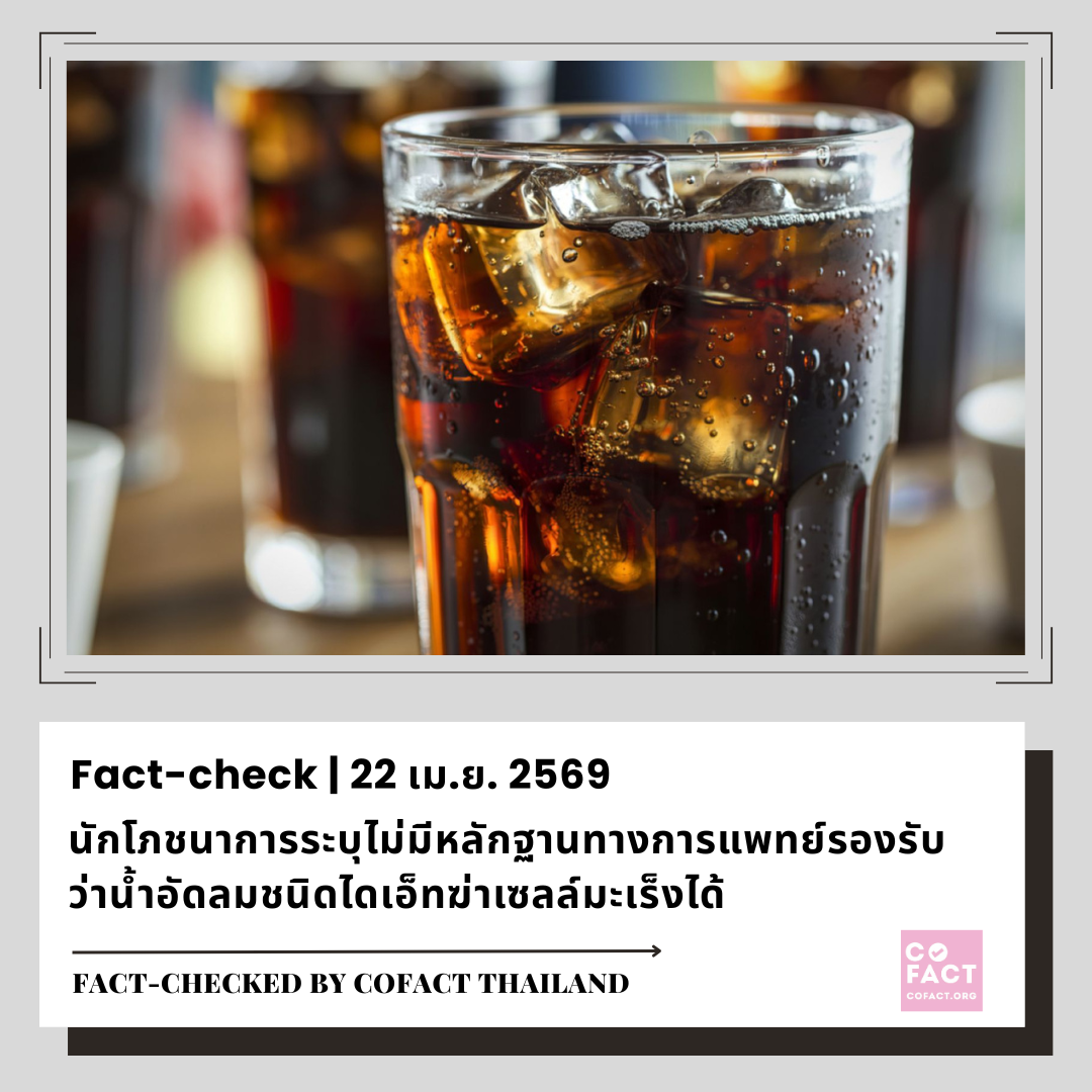 ❌ ผลการตรวจสอบข้อเท็จจริง: **ยังไม่มีผลการศึกษาที่ระบุว่าน้ำอัดลมไม่ผสมน้ำตาลหรือไดเอ็ทโซดาฆ่าเซลล์มะเร็งได้**
