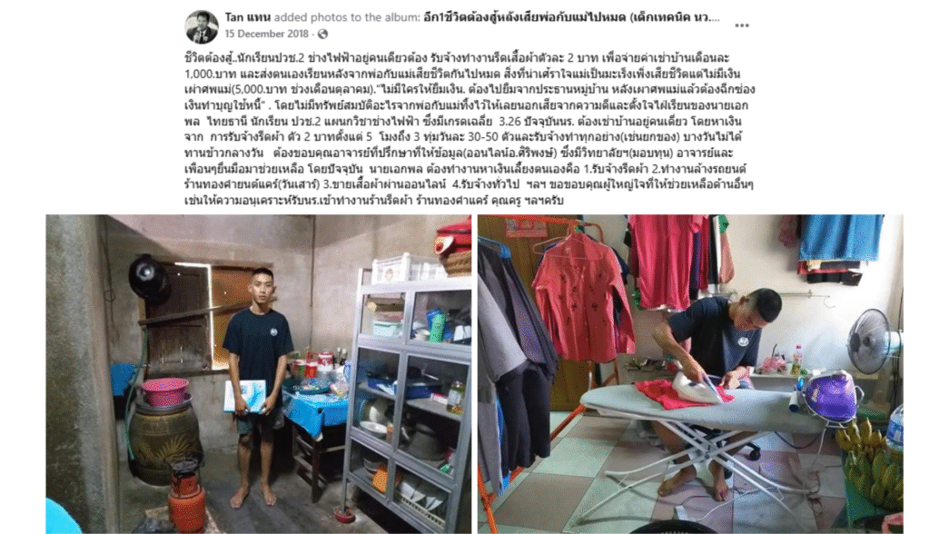 วันที่ 15 ธ.ค. 2561 ดร.แทนโพสต์ภาพและเรื่องราวของนักเรียนที่มีผลการเรียนดีแต่ยากจนชื่อเอกพล ไทยธานี นักเรียน ปวช. 2 แผนกวิชาช่างไฟฟ้า ข้อความว่า “ชีวิตต้องสู้..นักเรียนปวช.2 ช่างไฟฟ้าอยู่คนเดียวต้องรับจ้างทำงานรีดเสื้อผ้าตัวละ 2 บาท เพื่อจ่ายค่าเช่าบ้านเดือนละ 1,000 บาท และส่งตนเองเรียนหลังจากพ่อกับแม่เสียชีวิตกันไปหมด สิ่งที่น่าเศ้ราใจแม่เป็นมะเร็งเพิ่งเสียชีวิตแต่ไม่มีเงินเผ่าศพแม่ 5,000 บาท ไม่มีใครให้ยืมเงิน ต้องไปยืมจากประธานหมู่บ้าน หลังเผาศพแม่แล้วต้องฉีกซองเงินทำบุญใช้หนี้”