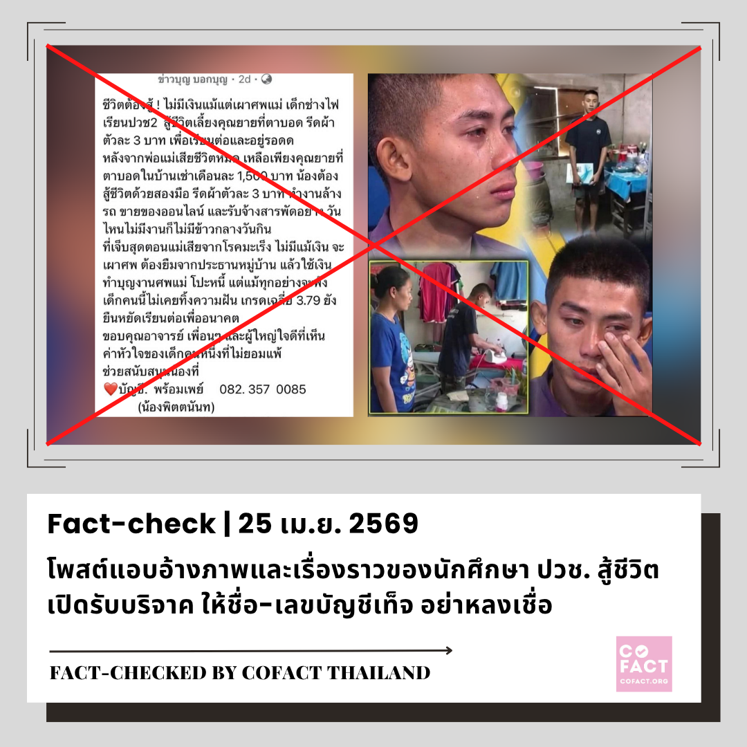 ❓ เนื้อหาที่ตรวจสอบ: โพสต์เปิดรับบริจาคช่วยเหลือหนุ่มนักศึกษา ปวช. พ่อแม่เสียชีวิต ต้องเลี้ยงดูยายตาบอด