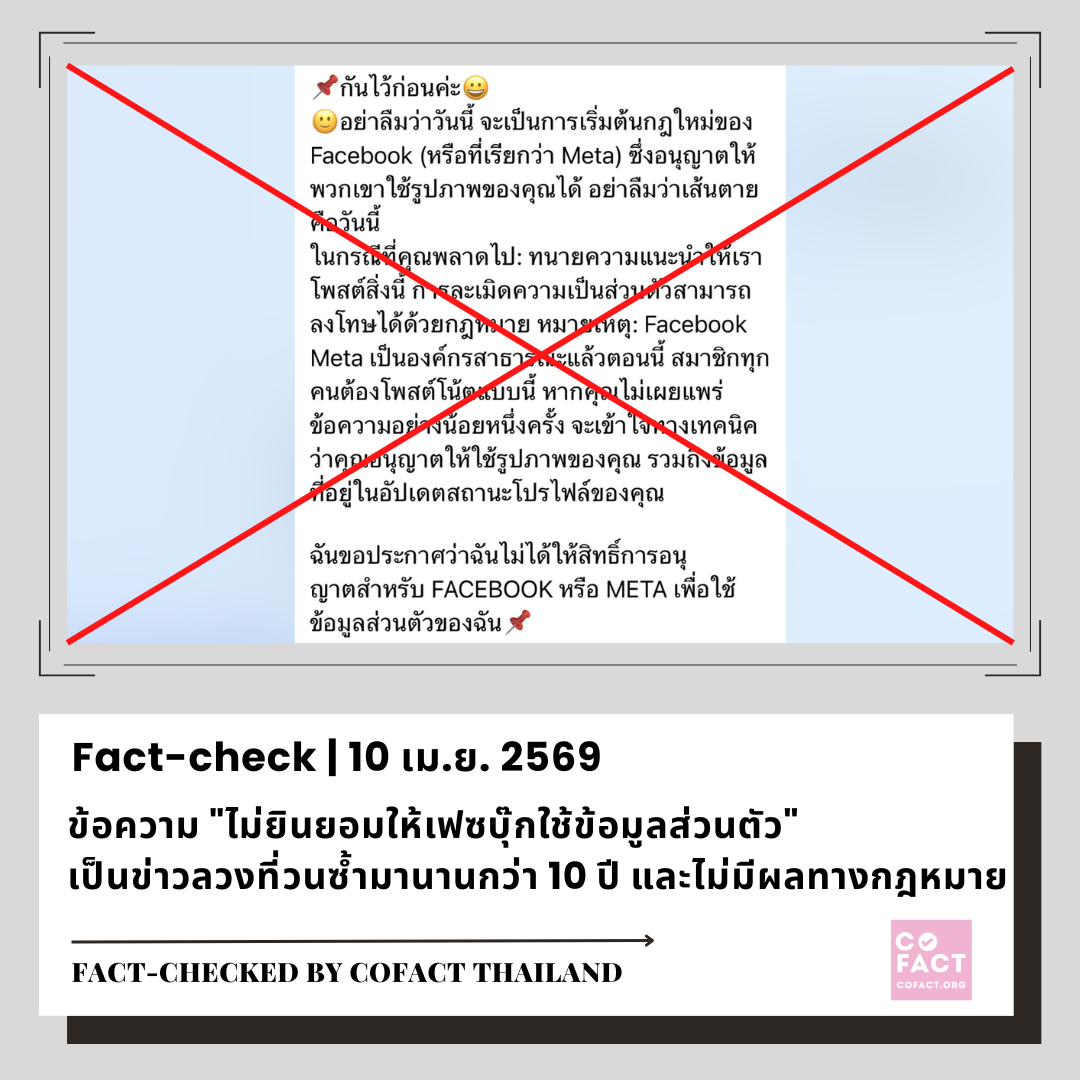 📝 เนื้อหาโดยสรุป: วันที่ 6-8 เม.ย. 2569 ผู้ใช้เฟซบุ๊กจำนวนมากโพสต์ข้อความว่า Meta บริษัทผู้ให้บริการเฟซบุ๊กมีกฎใหม่ว่าด้วยการใช้งานรูปภาพของผู้ใช้งาน หากไม่ต้องการให้ Meta ใช้รูปภาพต้องโพสต์ข้อความยืนยันว่าไม่อนุญาตให้ใช้ภาพและข้อมูลส่วนตัว