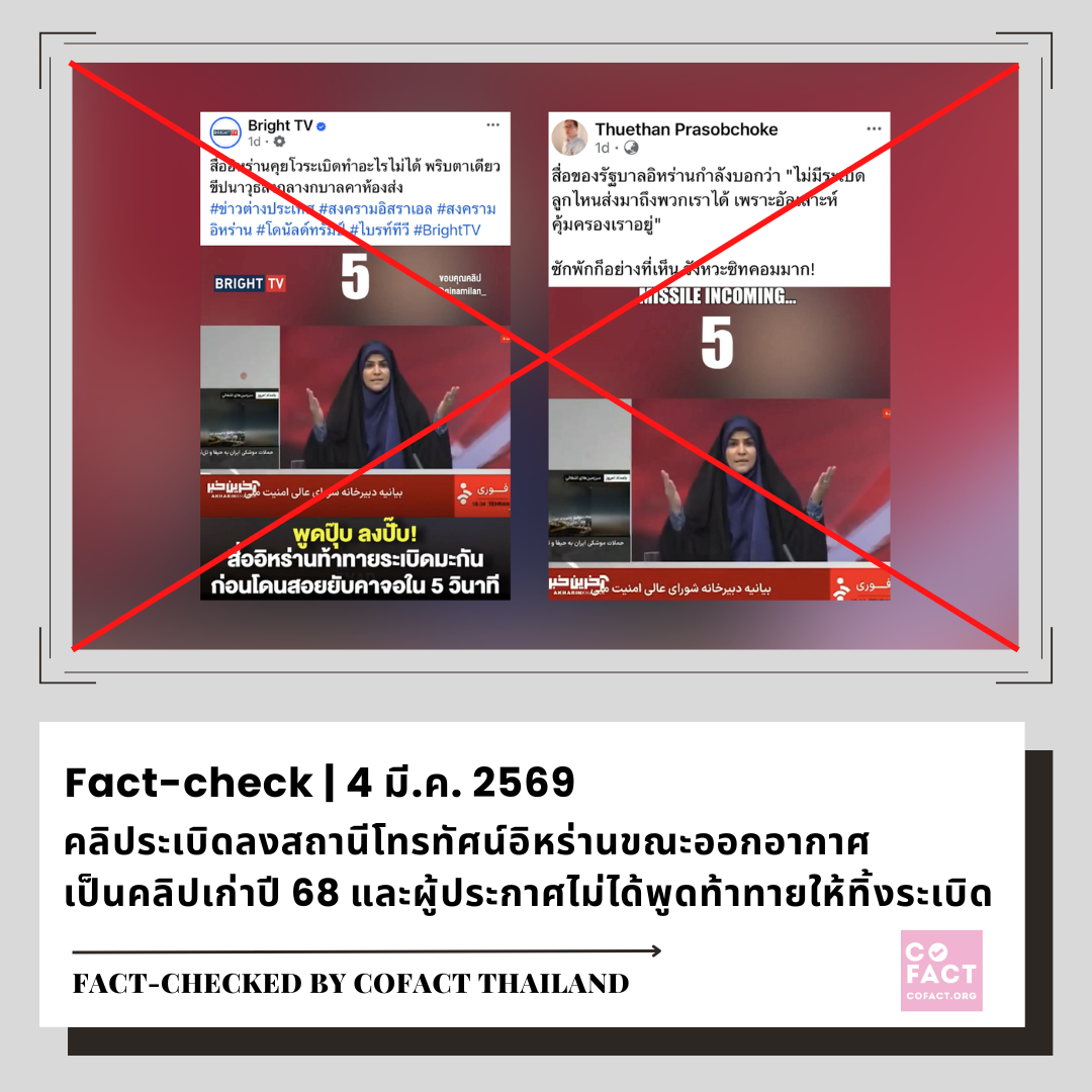 📝 เนื้อหาโดยสรุป: วันที่ 3 มี.ค. 2569 เพจเฟซบุ๊ก “Bright TV” เผยแพร่คลิปวิดีโอภาพเหตุโจมตีสถานีโทรทัศน์อิหร่านทำให้ผู้ประกาศหญิงต้องหนีเอาชีวิตรอดขณะกำลังออกอากาศสด ในคลิปฝังข้อความ “พูดปุ๊บ ลงปั๊บ สื่ออิหร่านท้าทายระเบิดมะกัน ก่อนโดนสอยยับคาจอใน 5 วินาที” คำบรรยายในโพสต์ระบุว่า “สื่ออิหร่านคุยโวระเบิดทำอะไรไม่ได้ พริบตาเดียวขีปนาวุธลงกลางกบาลคาห้องส่ง” และติดแฮชแท็กที่ทำให้เข้าใจว่าเป็นเหตุที่เกิดขึ้นในสถานการณ์การสู้รบในตะวันออกกลางที่กำลังดำเนินอยู่ในปัจจุบัน คลิปนี้มียอดชมมากกว่า 3.2 ล้านครั้ง ณ วันที่ 4 มี.ค. (ลิงก์บันทึก)