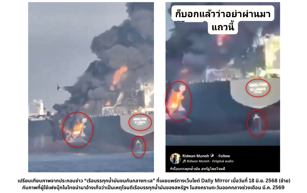 ❌ ผลการตรวจสอบข้อเท็จจริง: **เนื้อหาเท็จ** เป็นคลิปอุบัติเหตุเรือบรรทุกน้ำมันชนกันเมื่อเดือน มิ.ย. 2568 ไม่เกี่ยวข้องกับการสู้รบในตะวันออกกลางขณะนี้