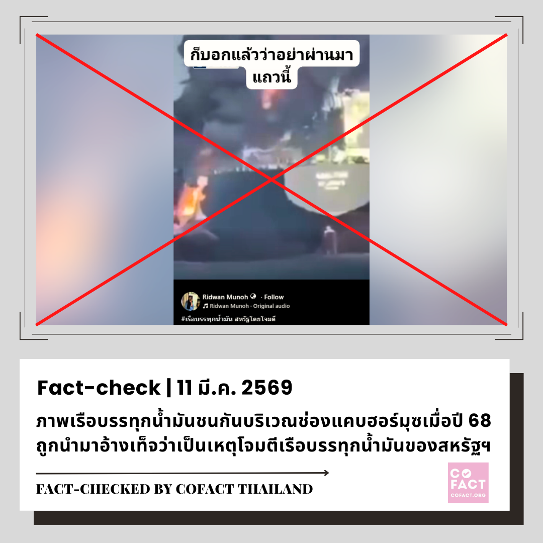 📝 เนื้อหาโดยสรุป: วันที่ 9 มี.ค. 2569 บัญชีเฟซบุ๊ก “Ridwan Munoh” โพสต์คลิปวิดีโอเป็นภาพเรือขนาดใหญ่เกิดเพลิงไหม้ ฝังข้อความในคลิปว่า “ก็บอกแล้วว่าอย่าผ่านมาแถวนี้” และมีข้อความบรรยายว่าเรือบรรทุกน้ำมันสหรัฐโดนโจมตี ณ วันที่ 11 มี.ค. 2569 คลิปนี้มียอดการรับชมกว่า 32,000 ครั้ง