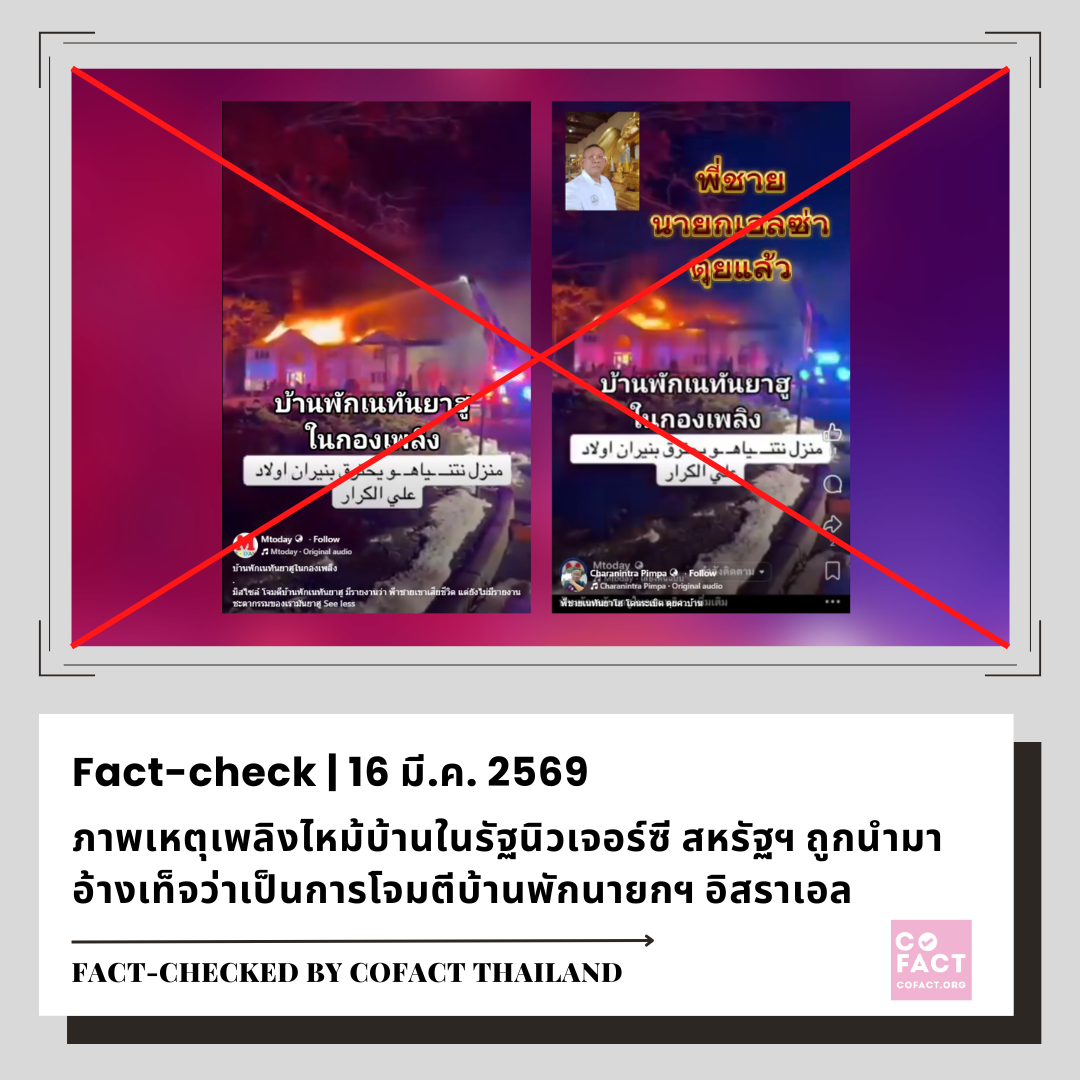 ❌ ผลการตรวจสอบข้อเท็จจริง: **เนื้อหาเท็จ** เป็นภาพเหตุการณ์ไฟไหม้บ้านในรัฐนิวเจอร์ซีย์ สหรัฐอเมริกา เมื่อวันที่ 9 ก.พ. 2569