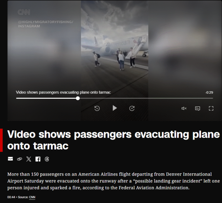 🔎 โคแฟคตรวจสอบ: เมื่อค้นหาด้วย Google Lens พบว่า คลิปดังกล่าวเป็นเหตุการณ์เครื่องบินของสายการบินอเมริกันแอร์ไลน์ เกิดไฟไหม้ที่สนามบินเดนเวอร์ สหรัฐอเมริกา ทำให้ต้องอพยพผู้โดยสารออกจากเครื่องเมื่อวันที่ 26 ก.ค. 2568 สื่อมวลชนสหรัฐฯ หลายสำนัก เช่น NBC, CNN และ New York Times รายงานว่าผู้โดยสาย 173 คนบนเครื่องบินโบอิง 737 ของสายการบินอเมริกันแอร์ไลน์ที่กำลังจะออกเดินทางจากสนามบินนานาชาติเดนเวอร์ไปยังไมอามีต้องอพยพออกจากเครื่องบินลงมาที่รันเวย์หลังจากระบบฐานล้อมีปัญหาทำให้เกิดไฟลุกไหม้