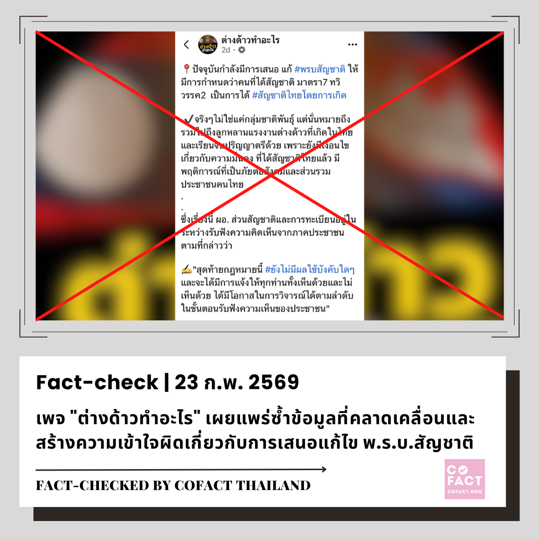 ข้อความที่เพจ “ต่างด้าวทำอะไร” โพสต์เมื่อ 21 ก.พ. 2569 จึงเป็นการนำข้อมูลที่คลาดเคลื่อนมาเผยแพร่ซ้ำทำให้เกิดความเข้าใจผิดว่าร่างแก้ไข พ.ร.บ.สัญชาติ จะทำให้ลูกหลานแรงงานต่างด้าวที่เกิดในไทยได้สัญชาติไทยโดยการเกิด