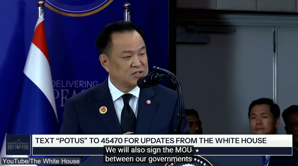 นายกฯ ไทยออกมาแถลงเป็นลำดับสุดท้ายต่อจากนายอันวาร์ อิบราฮิม นายกฯ มาเลเซีย และนายฮุน มาเนต นายกฯ กัมพูชา โดยกล่าวขอบคุณประธานาธิบดีทรัมป์ที่มีบทบาทสำคัญในการสร้างสันติภาพไทย-กัมพูชา