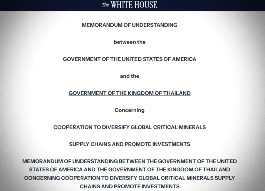 เวลาประมาณ 12.45 น. เว็บไซต์ทำเนียบขาวเผยแพร่ บันทึกความเข้าใจระหว่างรัฐบาลแห่งสหรัฐอเมริกาและรัฐบาลแห่งราชอาณาจักรไทยว่าด้วยความร่วมมือในการพัฒนาความหลากหลายของห่วงโซ่อุปทานของแร่ธาตุที่มีความสำคัญในระดับโลกและการส่งเสริมการลงทุน และราวสองชั่วโมงหลังจากนั้นก็เผยแพร่เอกสารสรุป (fact sheet) ภารกิจของผู้นำสหรัฐฯ ในการเยือนมาเลเซีย หนึ่งในนั้นคือการลงนามบันทึกเอ็มโอยูว่าด้วยความร่วมมือเกี่ยวกับแร่ธาตุหายากกับไทย