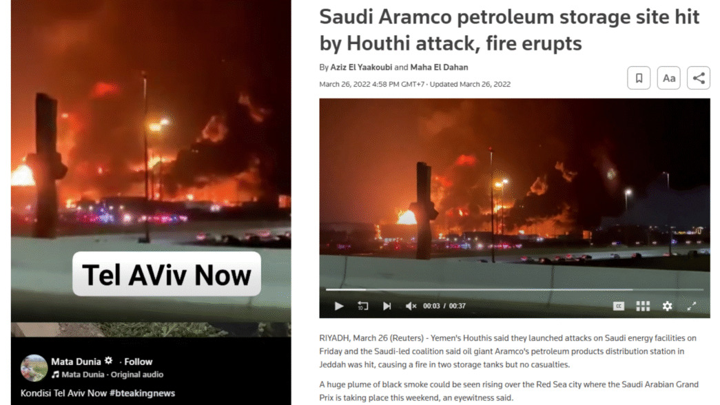 🔎 โคแฟคตรวจสอบ: เมื่อค้นหาด้วย Google Lens พบว่า คลิปเดียวกันเคยถูกเผยแพร่เมื่อวันที่ 26 มี.ค. 2565 โดยสำนักข่าวรอยเตอร์สซึ่งรายงานข่าวว่าเป็นเหตุการณ์กลุ่มกบฎฮูตีในเยเมนโจมตีคลังน้ำมันของ Aramco ในเมืองเจดดาห์ของซาอุดิอาระเบีย