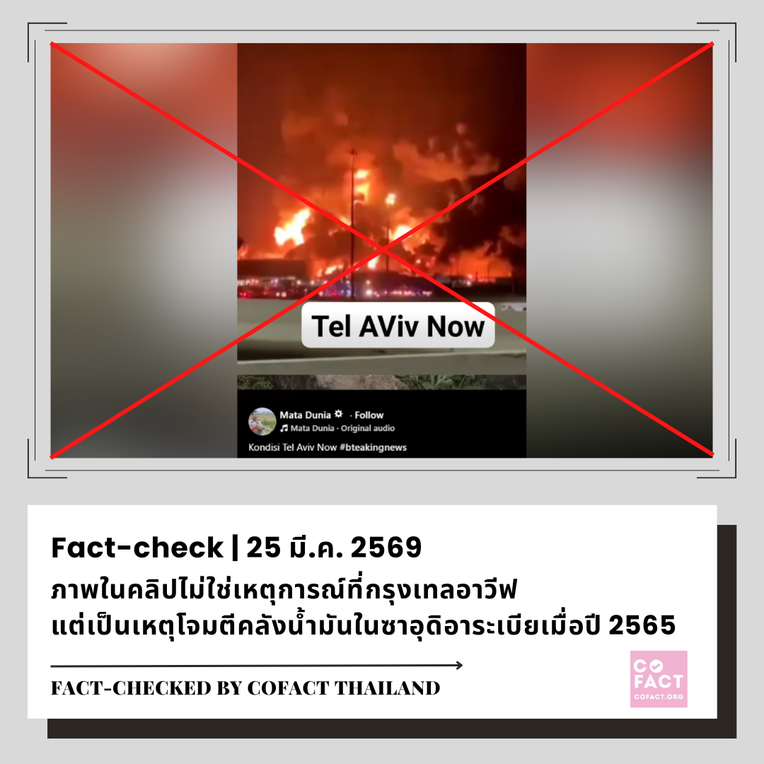 📝 เนื้อหาโดยสรุป: วันที่ 24 มี.ค. 2569 บัญชีเฟซบุ๊ก “Mata Dunia” โพสต์คลิปวิดีโอสถานที่แห่งหนึ่งมีไฟลุกท่วม ฝังข้อความและเขียนคำบรรยายที่ทำให้เข้าใจว่าเป็นเหตุไฟไหม้ในกรุงเทลอาวีฟ เมืองหลวงของประเทศอิสราเอล คลิปนี้ถูกแชร์มากกว่า 300 ครั้ง และมียอดรับชมมากกว่า 1.2 แสนครั้ง ณ วันที่ 25 มี.ค.