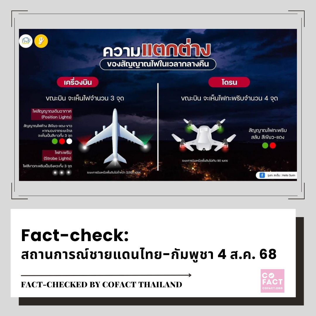 เนื้อหาโดยสรุป: หลังจากประชาชนในจังหวัดชายแดนไทย-กัมพูชา รายงานว่าพบเห็นวัตถุต้องสงสัยเป็นโดรนของฝั่งกัมพูชา ประกอบกับกองทัพบกยืนยันเมื่อวันที่ 2 ส.ค. 68 ว่าพบความพยายามบินตรวจการณ์ที่ตั้งทางทหารของไทย เพจเฟซบุ๊กต่าง ๆ ได้เผยแพร่อินโฟกราฟิกให้ข้อมูลวิธีการจำแนกไฟของเครื่องบินและโดรนในเวลากลางคืนเบื้องต้น วิธีการสังเกตหลัก ๆ คือ เครื่องบิน-ขณะบินจะเห็นไฟจำนวน 3 จุด ส่วนโดรน-ขณะบินจะเห็นไฟกระพริบจำนวน 4 จุด สลับสีเขียว-แดง