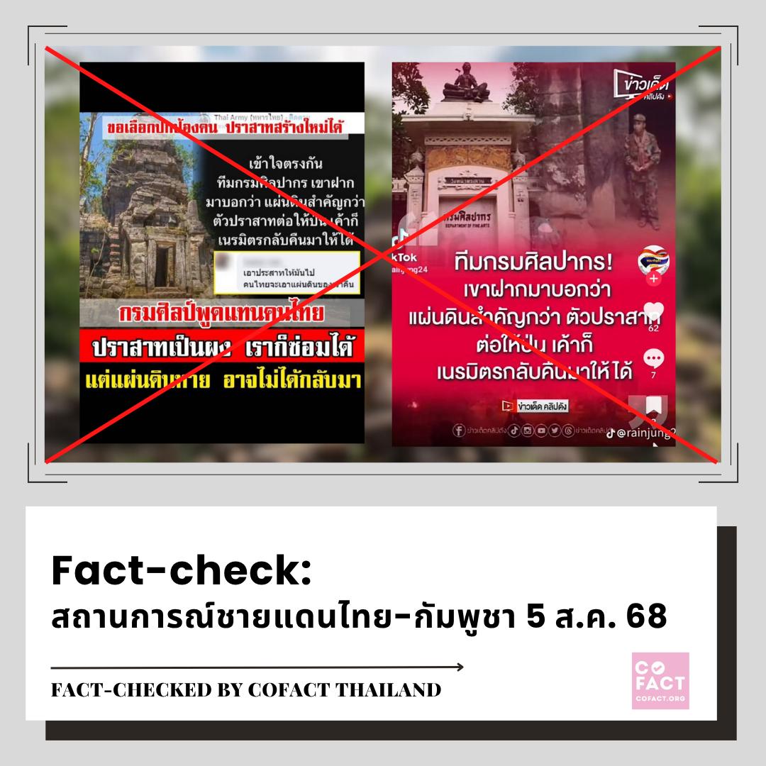 โคแฟคตรวจสอบ: วันนี้ (5 ส.ค. 68) กรมศิลปากรชี้แจงผ่านศูนย์ต่อต้านข่าวปลอมว่า กรมศิลปากรไม่เคยมีนโยบายหรือแสดงท่าทีว่าพร้อมให้ทำลายโบราณสถานใด ๆ เพื่อประโยชน์ทางทหาร