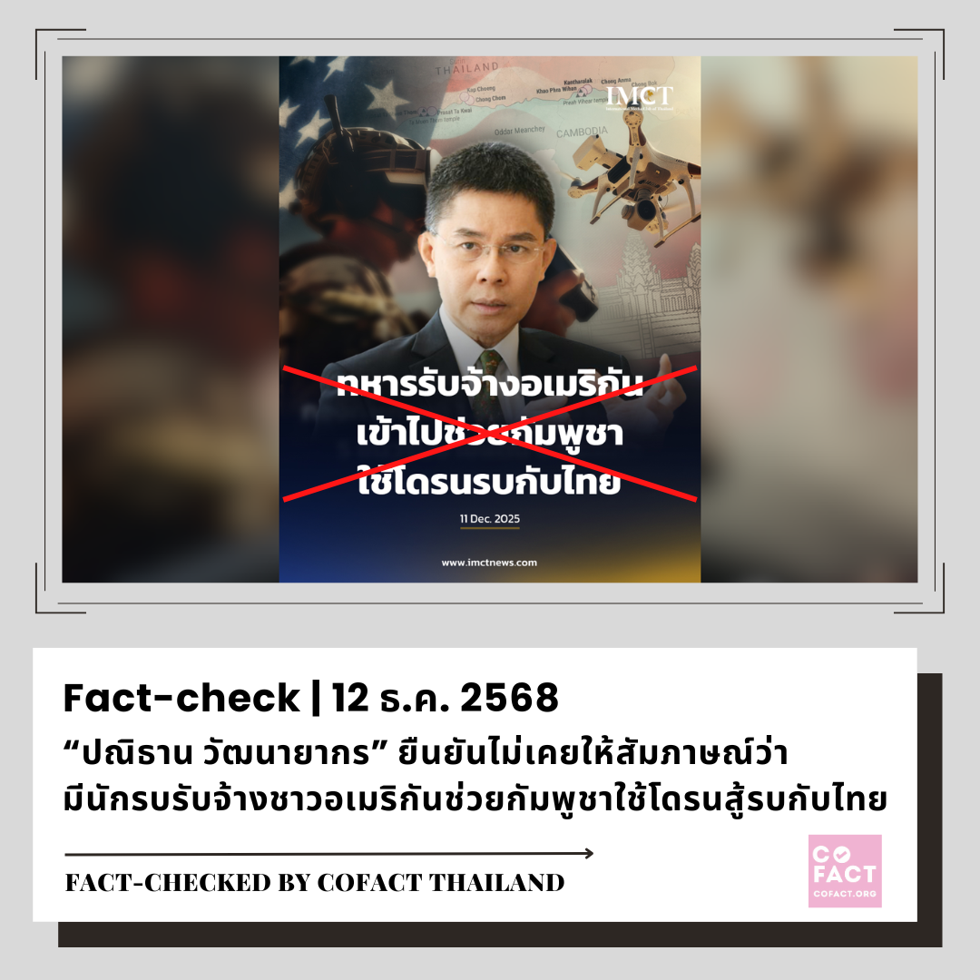 📝  เนื้อหาโดยสรุป: วันที่ 11 ธ.ค. 2568 เพจเฟซบุ๊ก “ThaiTribune” และ “IMCT News Thai Perspectives on Global News” โพสต์ภาพ รศ.ดร.ปณิธาน วัฒนายากร ผู้เชี่ยวชาญด้านความมั่นคง อดีตอาจารย์ภาควิชาความสัมพันธ์ระหว่างประเทศ คณะรัฐศาสตร์ จุฬาลงกรณ์มหาวิทยาลัย พร้อมข้อความ “ทหารรับจ้างอเมริกันเข้าไปช่วยกัมพูชาใช้โดรนรบกับไทย”