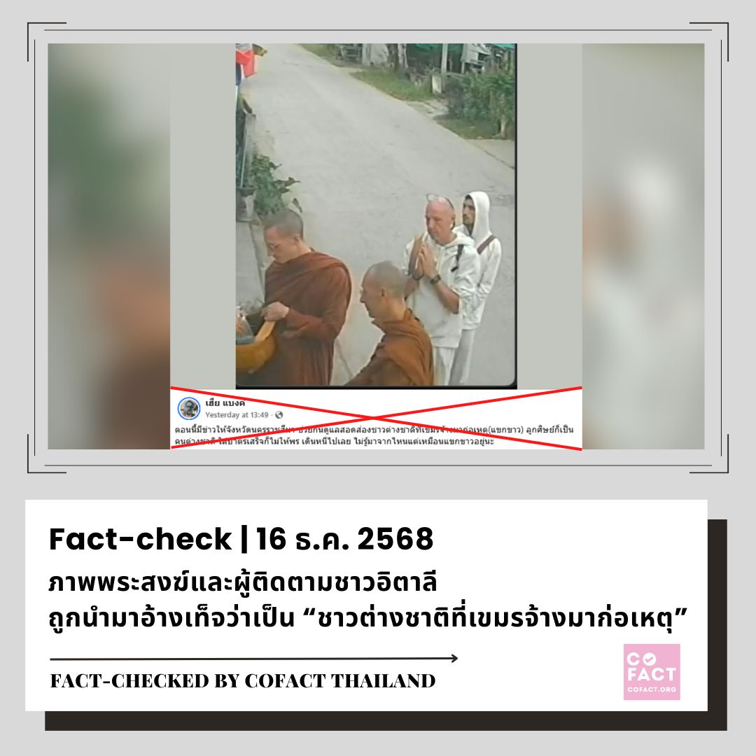 📝 เนื้อหาโดยสรุป: วันที่ 15 ธ.ค. 2568 เพจเฟซบุ๊ก “เฮีย แบงค์” โพสต์ภาพพระสงฆ์ชาวต่างชาติ 2 รูปขณะบิณฑบาตร โดยมีลูกศิษย์ชาวต่างชาติสองคนเป็นผู้ติดตาม เขียนข้อความบรรยายว่า “ตอนนี้มีข่าวให้จังหวัดนครราชสีมาช่วยกันดูแลสอดส่องชาวต่างชาติที่เขมรจ้างมาก่อเหตุ (แขกขาว) ลูกศิษย์ก็เป็นคนต่างชาติ ใส่บาตรเสร็จก็ไม่ให้พร เดินหนีไปเลย ไม่รู้มาจากไหนแต่เหมือนแขกขาวอยู่นะ” โพสต์นี้ถูกแชร์ไปมากกว่า 6,000 ครั้ง ณ วันที่ 16 ธ.ค. (ลิงก์บันทึก)