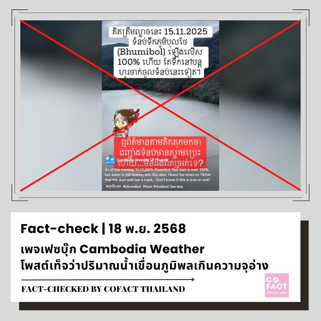 เพจเฟซบุ๊ก Cambodia Weather โพสต์เท็จว่าปริมาณน้ำเขื่อนภูมิพลเกินความจุอ่าง