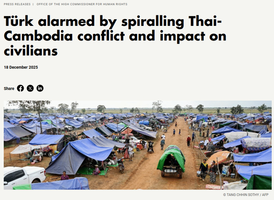 รายงานข่าวของ OHCHR ซึ่งอังคณาอ้างอิงข้อมูลมาระบุว่า โวลเกอร์ เติร์ก ข้าหลวงใหญ่สิทธิมนุษยชนแห่งสหประชาชาติแสดงความกังวลถึงความปลอดภัยของพลเรือนที่ได้รับผลกระทบจากการสู้รบระหว่างไทยกับกัมพูชาระลอกล่าสุดที่เริ่มมาตั้งแต่วันที่ 7 ธ.ค. และย้ำถึงความจำเป็นที่จะต้องปกป้องความปลอดภัยของพลเมืองไทยและกัมพูชา