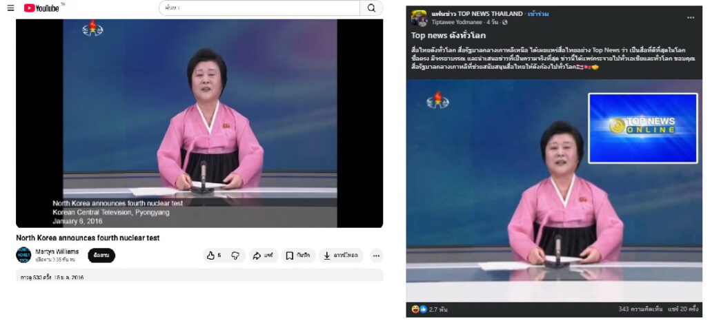 🔎 โคแฟคตรวจสอบ: จากการค้นหาภาพด้วย Yandex Image Search พบว่า ภาพดังกล่าวมาจากคลิปข่าว “North Korea announces fourth nuclear test” ที่เผยแพร่โดยบัญชียูทูบ “Martyn Williams” เมื่อวันที่ 15 ม.ค. 2559 โดยระบุว่าสำนักข่าวกลางของรัฐบาลเกาหลีเหนือที่กรุงเปียงยางรายงานข่าวเกาหลีเหนือประกาศทดลองนิวเคลียร์ครั้งที่ 4 เมื่อวันที่ 6 ม.ค. 2559