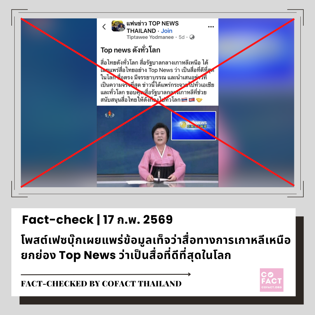 📝 เนื้อหาโดยสรุป: วันที่ 12 ก.พ. 2569 สมาชิกกลุ่มเฟซบุ๊ก “แฟนข่าว TOP NEWS THAILAND” โพสต์ภาพของ รี ชุน-ฮี (Ri Chun-hee) ผู้ประกาศข่าวชาวเกาหลีเหนือ ด้านขวามีโลโก้สถานีโทรทัศน์ Top News พร้อมข้อความระบุว่า “Top news ดังทั่วโลก สื่อไทยดังทั่วโลก สื่อรัฐบาลกลางเกาหลีเหนือ ได้เผยแพร่สื่อไทยอย่าง Top News ว่า เป็นสื่อที่ดีที่สุดในโลก ซื่อตรง มีจรรยาบรรณ และนำเสนอข่าวที่เป็นความจริงที่สุด ข่าวนี้ได้แพร่กระจายไปทั่วเอเชียและทั่วโลก ขอบคุณสื่อรัฐบาลกลางเกาหลีที่ช่วยสนับสนุนสื่อไทยให้ดังก้องไปทั่วโลก” (ลิงก์บันทึก)