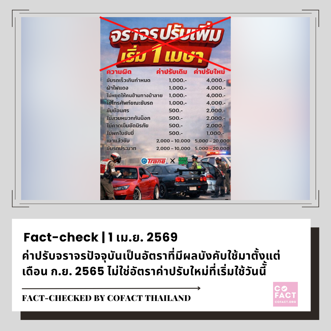 🔎 โคแฟคตรวจสอบ: จากการตรวจสอบรายงานข่าวและข้อมูลเกี่ยวกับอัตราค่าปรับจราจรที่เผยแพร่โดยหน่วยงานที่เกี่ยวข้องพบว่าอัตราค่าปรับจราจรที่เพิ่มขึ้นนี้เป็นไปตาม พ.ร.บ.จราจรทางบก ฉบับที่ 13 พ.ศ.2565 ซึ่งเป็น พ.ร.บ.จราจรทางบกฉบับแก้ไขล่าสุด ประกาศในราชกิจจานุเบกษาเมื่อวันที่ 7 พ.ค. 2565 และมีผลบังคับใช้เมื่อวันที่ 7 ก.ย. 2565 ไม่ใช่เพิ่งมีผลบังคับใช้ในวันนี้ (1 เม.ย. 2569) ตามที่ผู้ใช้โซเชียลมีเดียกล่าวอ้าง
