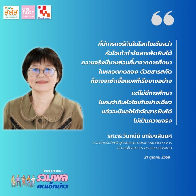 วันที่ 21 ตุลาคม 2568 รายการ “รวมพลคนเช็กข่าว” EP.22 โดย COFACT ได้นำเสนอประเด็นร้อนในโลกออนไลน์เกี่ยวกับสรรพคุณของหัวไชเท้าที่ถูกกล่าวอ้างว่าเป็น “อาหารทางการแพทย์อันดับสองของโลก” และมีคุณสมบัติกำจัดสารพิษ ขับมะเร็ง และรักษาโรคสารพัด ผู้ร่วมรายการประกอบด้วย สุภิญญา กลางณรงค์ ผู้ร่วมก่อตั้ง COFACT, รศ.ดร.วันทนีย์ เกรียงสินยศ อาจารย์ประจำหลักสูตรโภชนาการและการกำหนดอาหาร สถาบันโภชนาการ มหาวิทยาลัยมหิดล, กฤษฎา วงศ์ไข่ จากวิทยุชุมชนคนเมืองลี้ ลำพูน และผู้ดำเนินรายการ สุชัย เจริญมุขยนันท