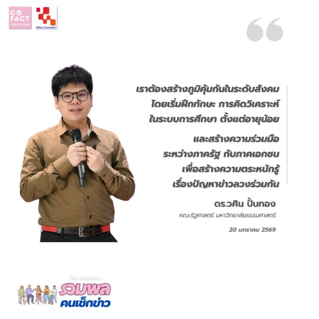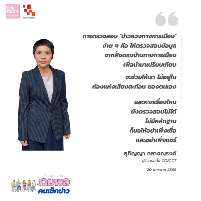20 มกราคม 2569 – รายการ “โคแฟคสนทนา : รวมพลคนเช็กข่าว” ตอน “เจาะข่าวลวงช่วงเลือกตั้ง” ดำเนินรายการโดยสุชัย เจริญมุขยนันท โดยมีผู้ร่วมเสวนาคือ สุภิญญา กลางณรงค์ ผู้ร่วมก่อตั้งโคแฟค (Cofact) และ ดร.วศิน ปั้นทอง จากคณะรัฐศาสตร์ มหาวิทยาลัยธรรมศาสตร์ ร่วมวิเคราะห์สถานการณ์ข้อมูลข่าวสารในช่วงโค้งสุดท้ายก่อนการเลือกตั้งทั่วไป ที่จะมีขึ้นในวันที่ 8 กุมภาพันธ์ 2562 ซึ่งโซเชียลมีเดียได้กลายเป็นอาวุธสำคัญในการโฆษณาชวนเชื่อยุคใหม่