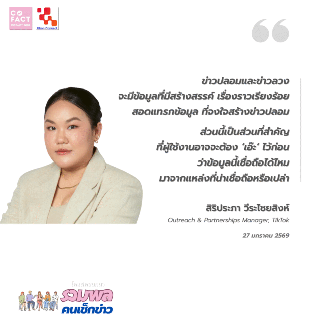 (27 มกราคม 2569) – รายการ “โคแฟคสนทนา: รวมพลคนเช็กข่าว EP.26” หัวข้อ “ฝ่าข่าวลวงช่วงเลือกตั้ง” ดำเนินรายการโดย นายสุชัย เจริญมุขยนันท ได้พูดคุยถึงประเด็นร้อนในช่วง 12 วันสุดท้ายก่อนการเลือกตั้งทั่วไป โดยเชิญแพลตฟอร์มยักษ์ใหญ่อย่าง TikTok มาร่วมถกเถียงถึงมาตรการรับมือข่าวปลอม (Fake News) และการบิดเบือนข้อมูลที่อาจส่งผลต่อการตัดสินใจของผู้มีสิทธิเลือกตั้ง