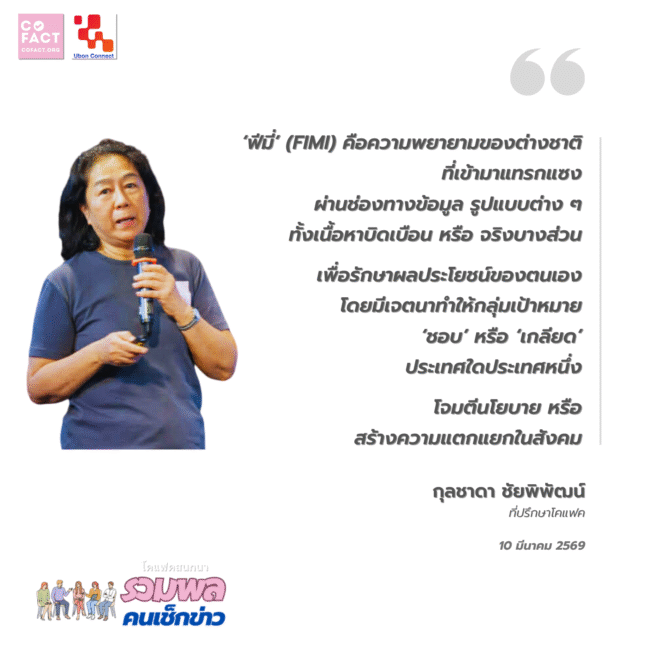 กุลชาดา ชัยพิพัฒน์ ที่ปรึกษาโคแฟค อธิบายความหมายของ FIMI หรือ “ฟีมี่” ให้เข้าใจง่ายว่า คือความพยายามของต่างชาติที่เข้ามาแทรกแซงผ่านช่องทางข้อมูลรูปแบบต่างๆ ทั้งเนื้อหาบิดเบือนหรือจริงบางส่วน เพื่อรักษาผลประโยชน์ของตนเอง โดยมีเจตนาทำให้กลุ่มเป้าหมายชอบหรือเกลียดประเทศใดประเทศหนึ่ง โจมตีนโยบาย หรือสร้างความแตกแยกในสังคม สิ่งที่ทำให้ FIMI ต่างจากข้อมูลเท็จทั่วไปคือ “กระบวนการที่มีการวางแผน” มีการประสานงานกันผ่านเครือข่ายบัญชีปลอมหรือบอต (Bot) จำนวนมากเพื่อปั่นข้อความให้กระจายไปสู่คนหมู่มากในเวลาอันรวดเร็ว