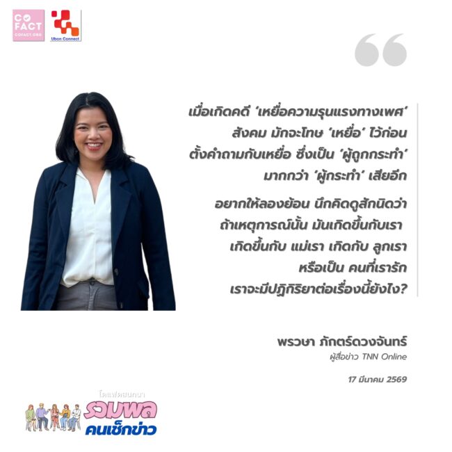 ประเด็นที่น่าสะเทือนใจที่สุดคือผลกระทบต่อผู้หญิงและเด็ก โดยพรวษาระบุว่ากลุ่มนี้เป้าหมายที่เปราะบางที่สุด และสังคมมักมีอคติด้วยการ “โทษเหยื่อ” (Victim Blaming) เช่น การตั้งคำถามว่าทำไมไม่หนี หรือทำไมเพิ่งออกมาพูดหลังจากผ่านไปหลายสิบปี ซึ่งในความเป็นจริงเหยื่อต้องเผชิญกับอิทธิพลมืดและความบอบช้ำทางใจอย่างรุนแรง ทั้งนี้เธอยังเสนอแนะว่าควรมีการบังคับใช้กฎหมายอย่างจริงจัง เช่น พ.ร.บ. การคุกคามทางเพศ และสื่อควรเลิกผลิตซ้ำความรุนแรงหรือการนำเสนอที่ทำให้การล่วงละเมิดดูเป็นเรื่องโรแมนติก