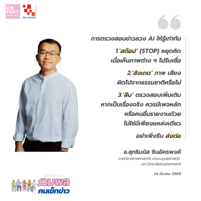 สำหรับการตรวจสอบเบื้องต้น อาจารย์สุทธิมนัสได้แนะนำจุดสังเกตสำคัญ 3 องค์ประกอบ คือ 1. ภาพนิ่ง: ให้สังเกตความบิดเบี้ยวของตัวหนังสือที่มักจะซ้อนทับกันหรืออ่านไม่ออก รูปร่างของคนที่อยู่พื้นหลังอาจดูผิดปกติคล้ายซอมบี้ รวมถึงหลักฟิสิกส์ของแสงและเงาที่อาจไม่สัมพันธ์กัน 2. วิดีโอ: ให้ดูความต่อเนื่องของการเคลื่อนไหวเช่น การเดินที่ขาสลับข้างกันอย่างไม่เป็นธรรมชาติ การกะพริบตาที่ผิดปกติ และการขยับปากที่ไม่ตรงกับเสียง (Lip-sync) 100% และ3. เสียง: สังเกตจังหวะการหายใจและการเว้นวรรคตอนที่อาจจะต่อเนื่องกันเกินไปจนผิดธรรมชาติมนุษย์